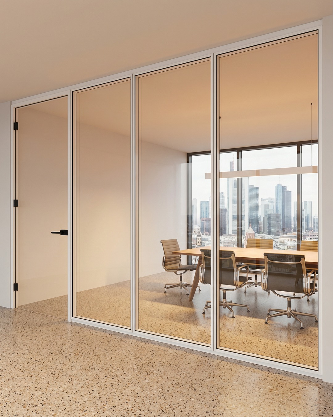 Die bündigen Decken- und Bodenanschlüsse garantieren eine saubere Integration in Ihre Räumlichkeiten. Unsere Rahmentüren sind flächenbündig in das System integriert und verfügen über eine elegante schwarze Klinke (Lever Handle) mit integriertem Schlosskasten – ein klares Statement gegen klobige Beschläge.
