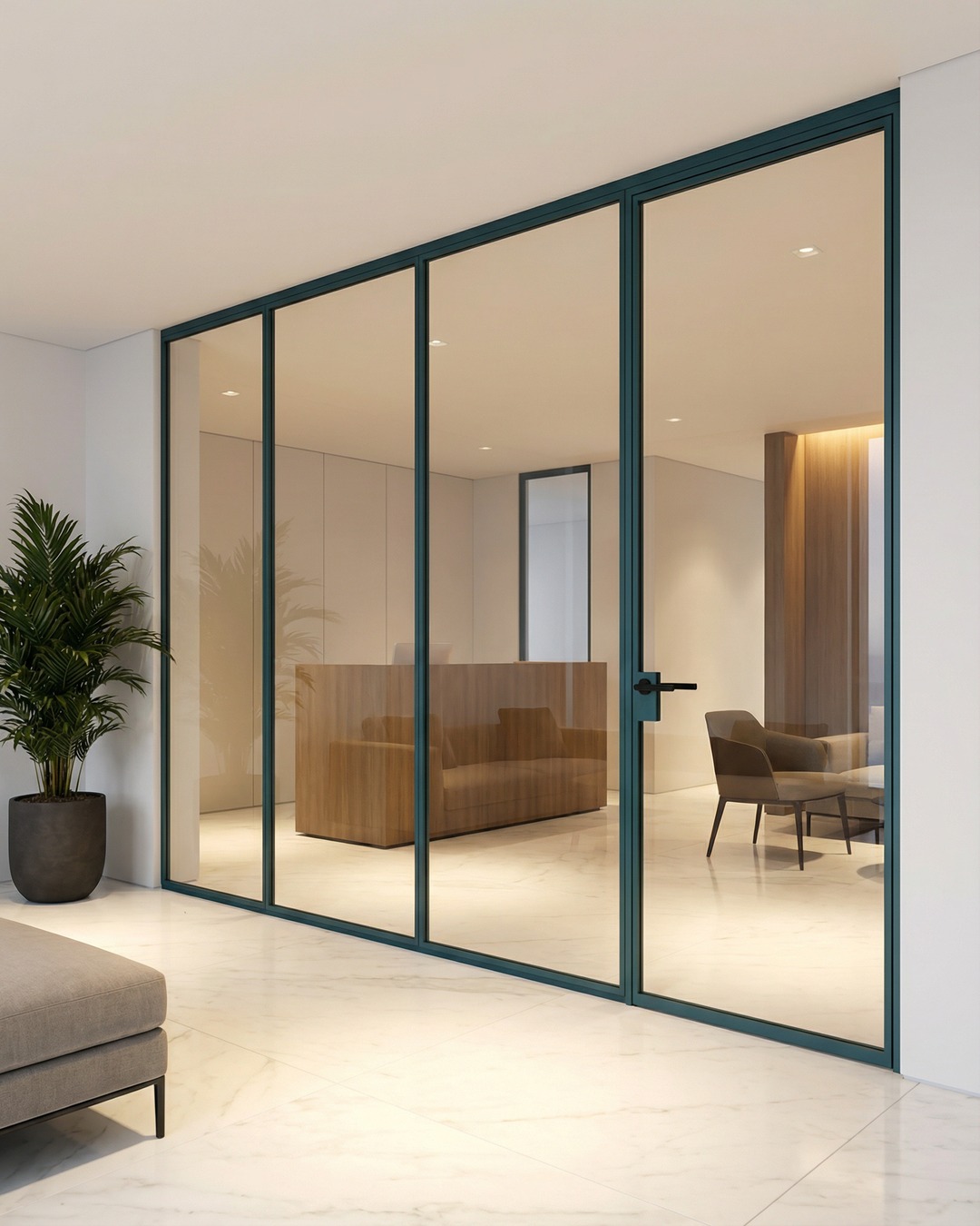 Die XFRAME DNA basiert auf einem modularen Rahmensystem, bei dem jedes Glaselement einen eigenen, umlaufenden Aluminiumrahmen mit einer Ansichtsbreite von ca. 20 mm erhält. Diese ultra-schlanken Profile erzeugen eine filigrane Optik, die in Hamburgs anspruchsvollen Büroumgebungen überzeugt. Über den Hauptglaselementen kann ein horizontales Oberlicht (Transom) mit eigenem Rahmen integriert werden, das die Raumhöhe optimal ausnutzt.